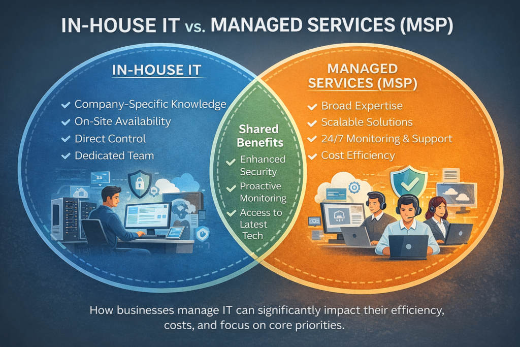 Today, the conversation isn’t about internal IT versus managed services, but about how the two can work together. Internal IT teams bring deep knowledge of the organization, while managed service providers add specialized expertise, scalability, and 24/7 support.